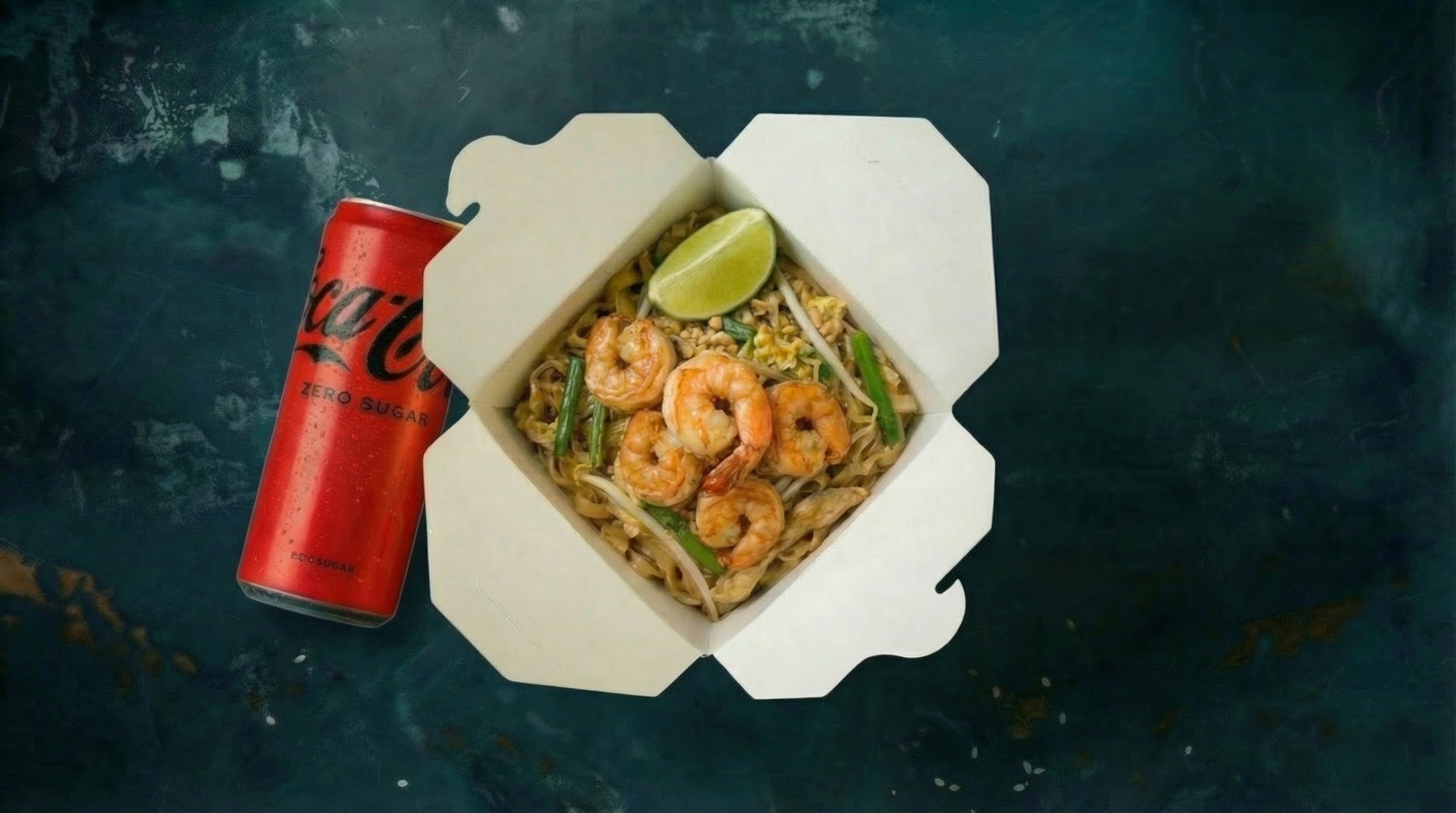 Risnudlar kastade i en het wokpanna med vår egen tamarindsås, böngroddar och en touch av chili. Välj mellan kycklingfilé, vegetarisk eller räkor. Krossade jordnötter och lime kommer med.