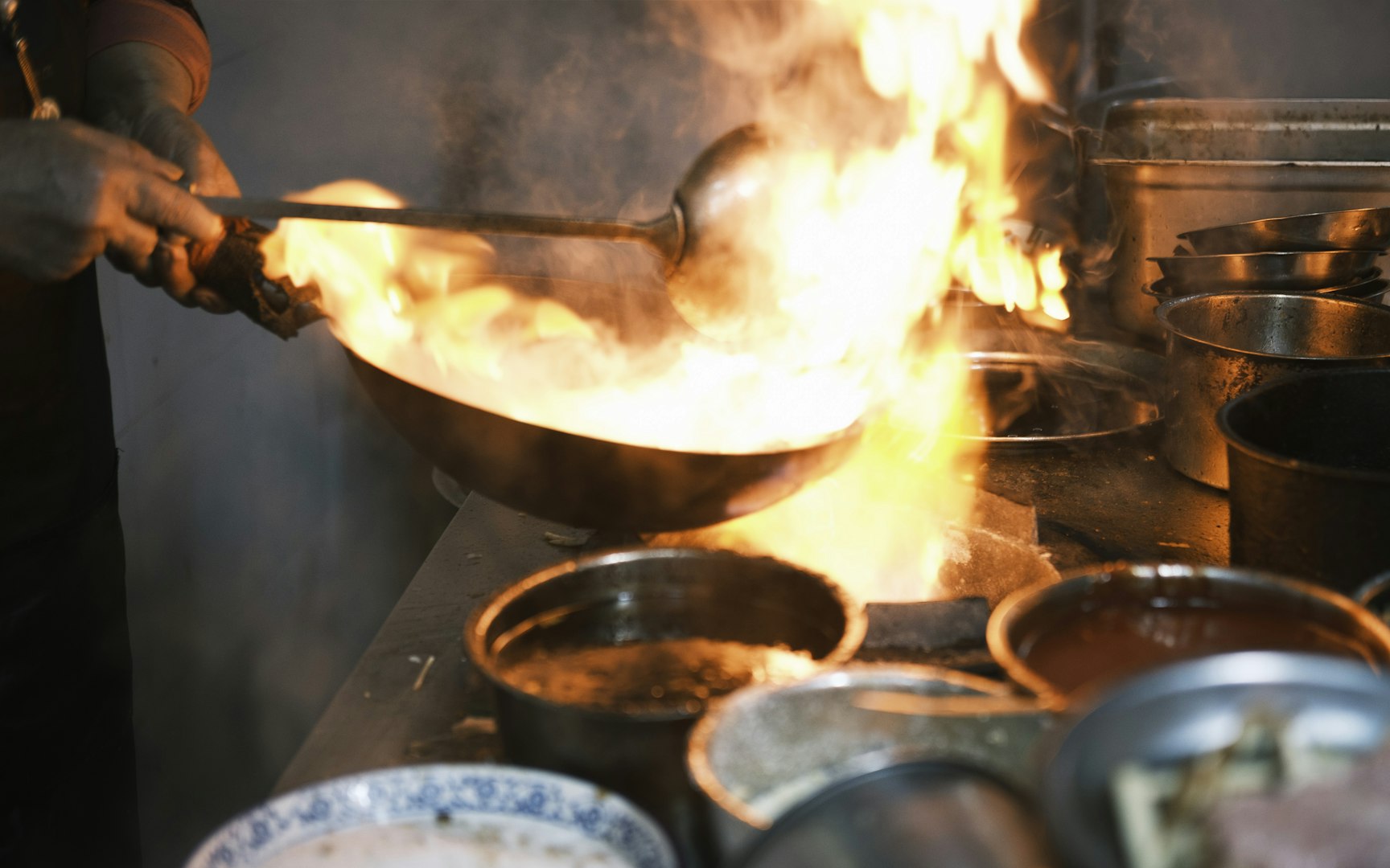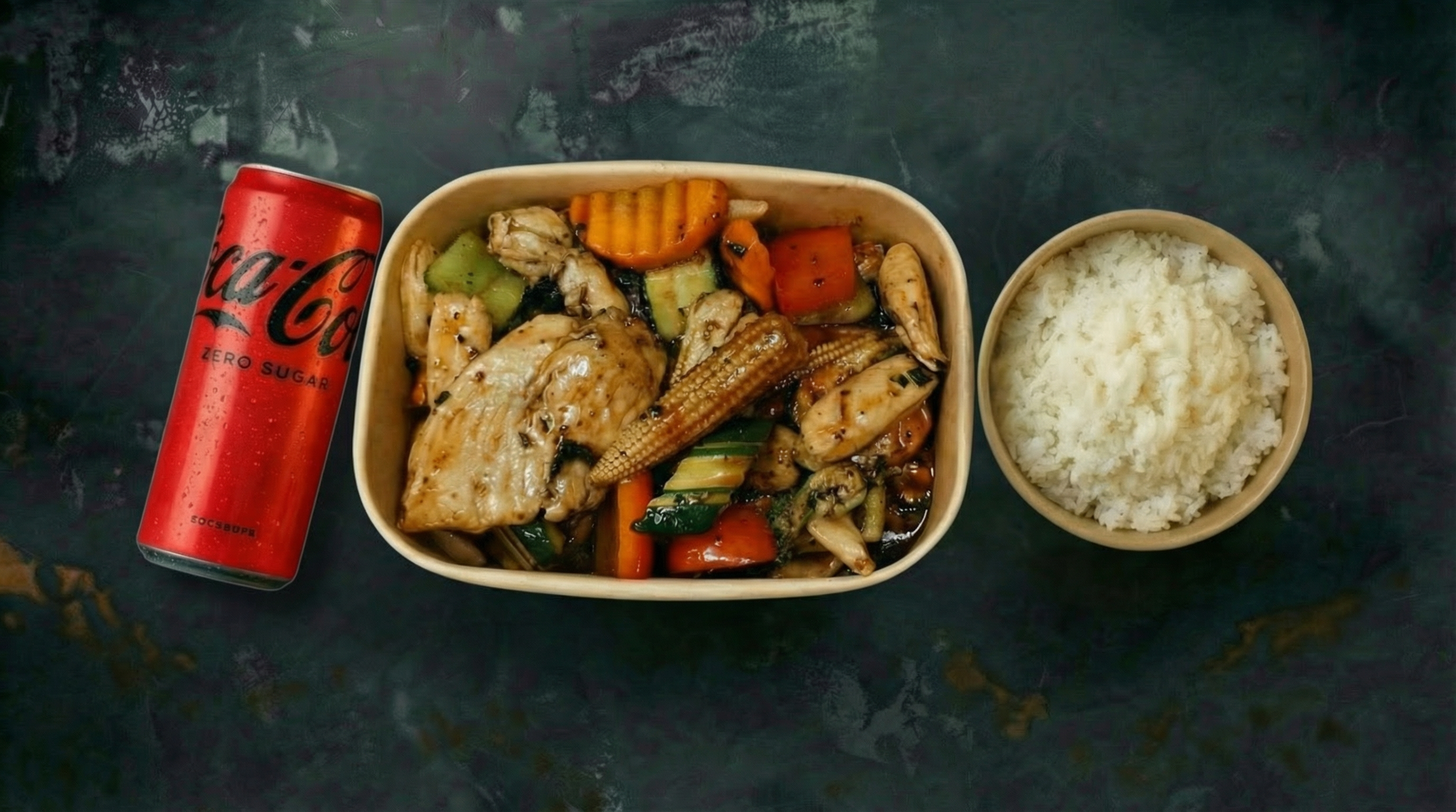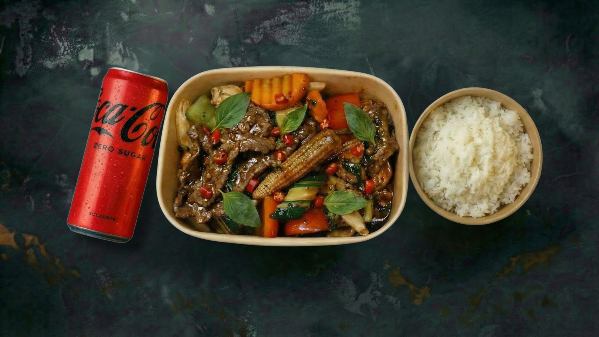 Het wok med kycklingfilé, biff eller räkor, slungad i rykande svartpepparsås, koriander, thai basilika och röd chili som bränner till direkt. Jasminris ingår.