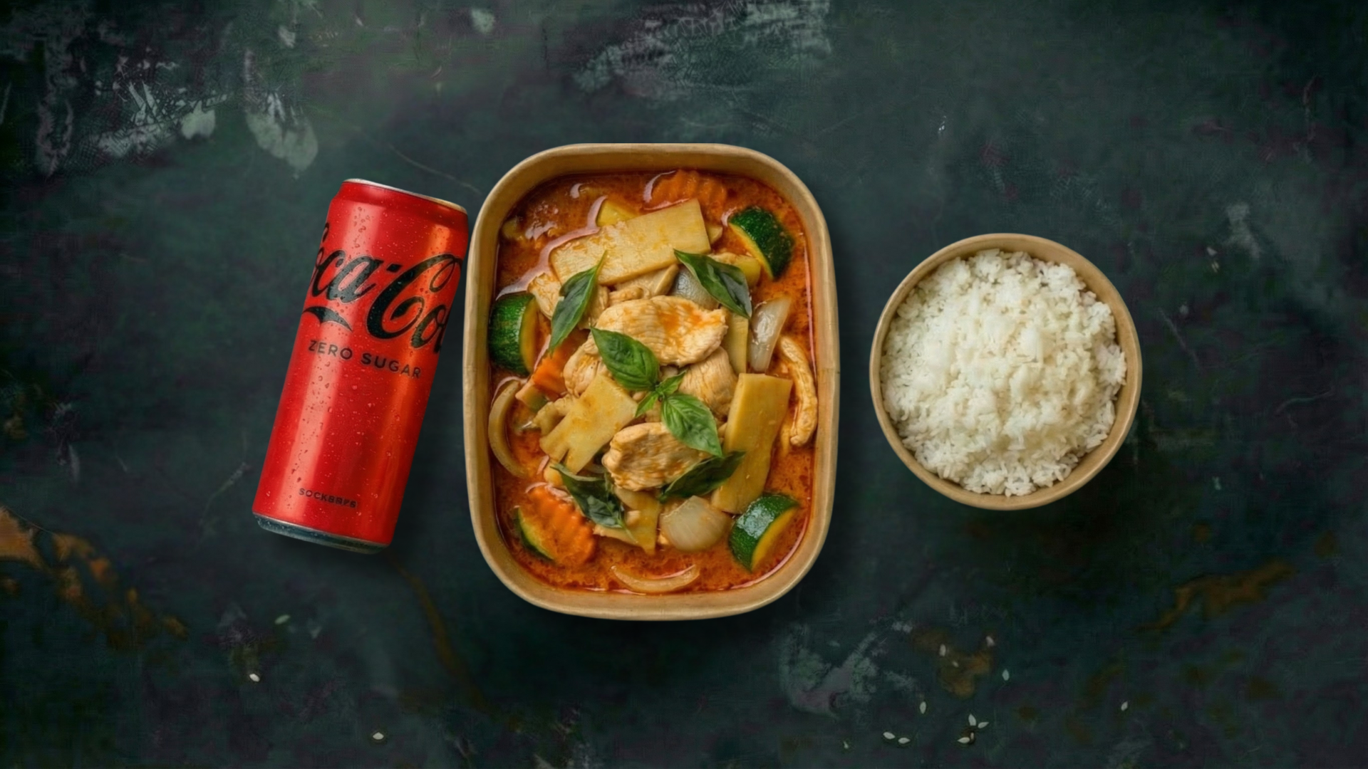 Kycklingfilé, vegetarisk eller räkor i het thai röd curry. Krämig kokosmjölk, chili och thai basilika i en flavor-bomb av örter och kryddor. Jasminris ingår.
