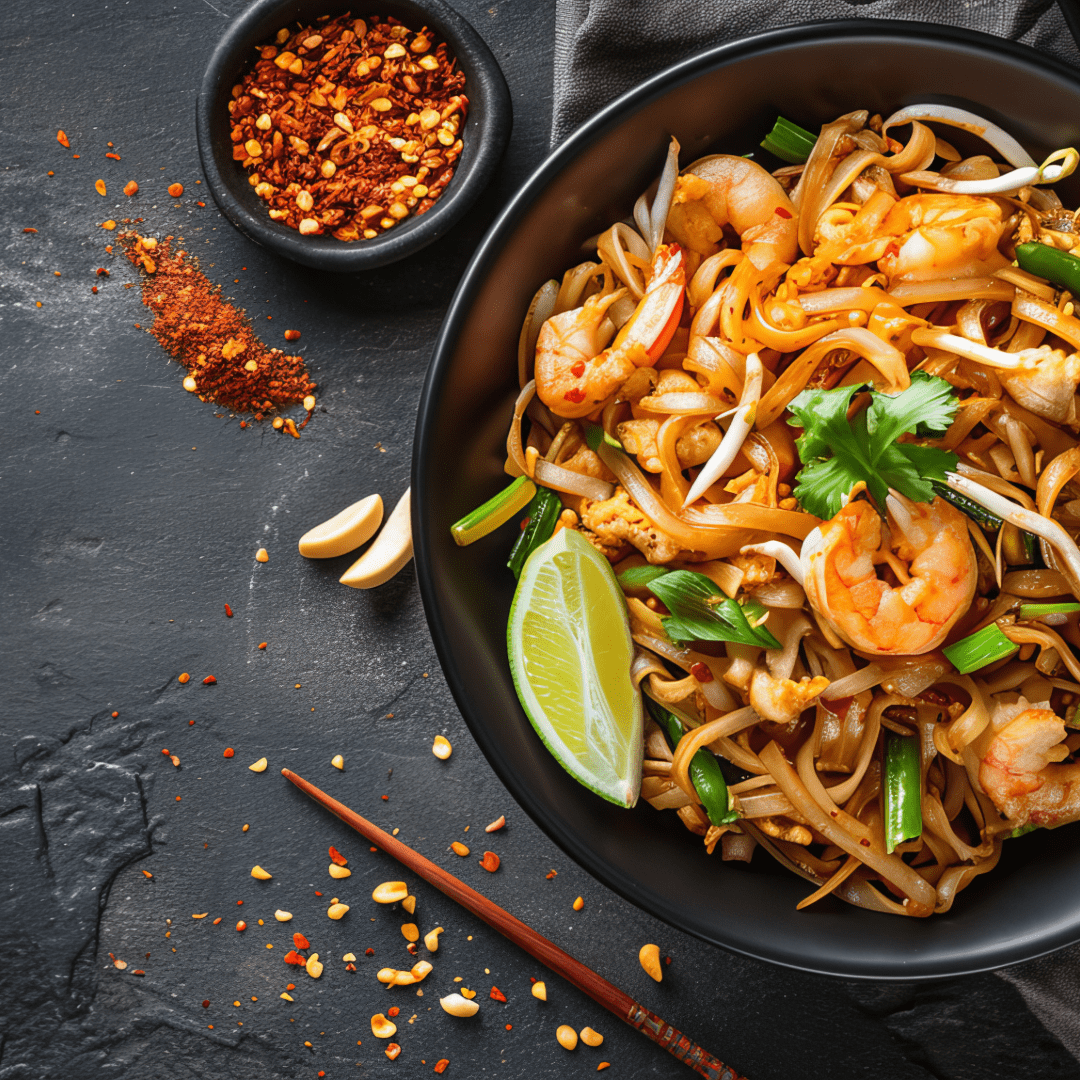 Risnudlar kastade i en het wokpanna med vår egen tamarindsås, böngroddar och en touch av chili. Välj mellan kycklingfilé, vegetarisk eller räkor. Krossade jordnötter och lime kommer med.