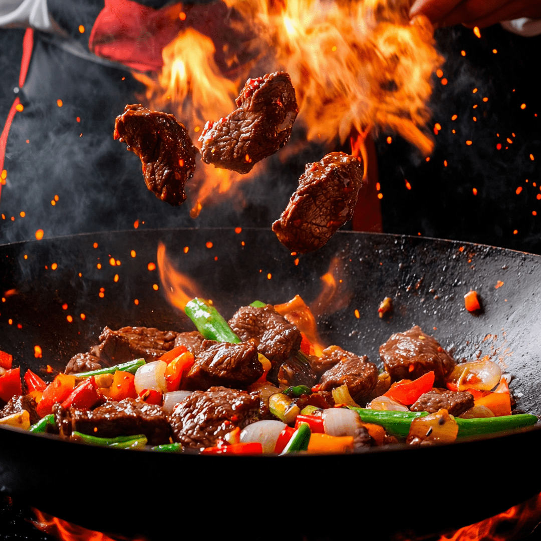 Het wok med kycklingfilé, biff eller räkor, slungad i rykande svartpepparsås, koriander, thai basilika och röd chili som bränner till direkt. Jasminris ingår.